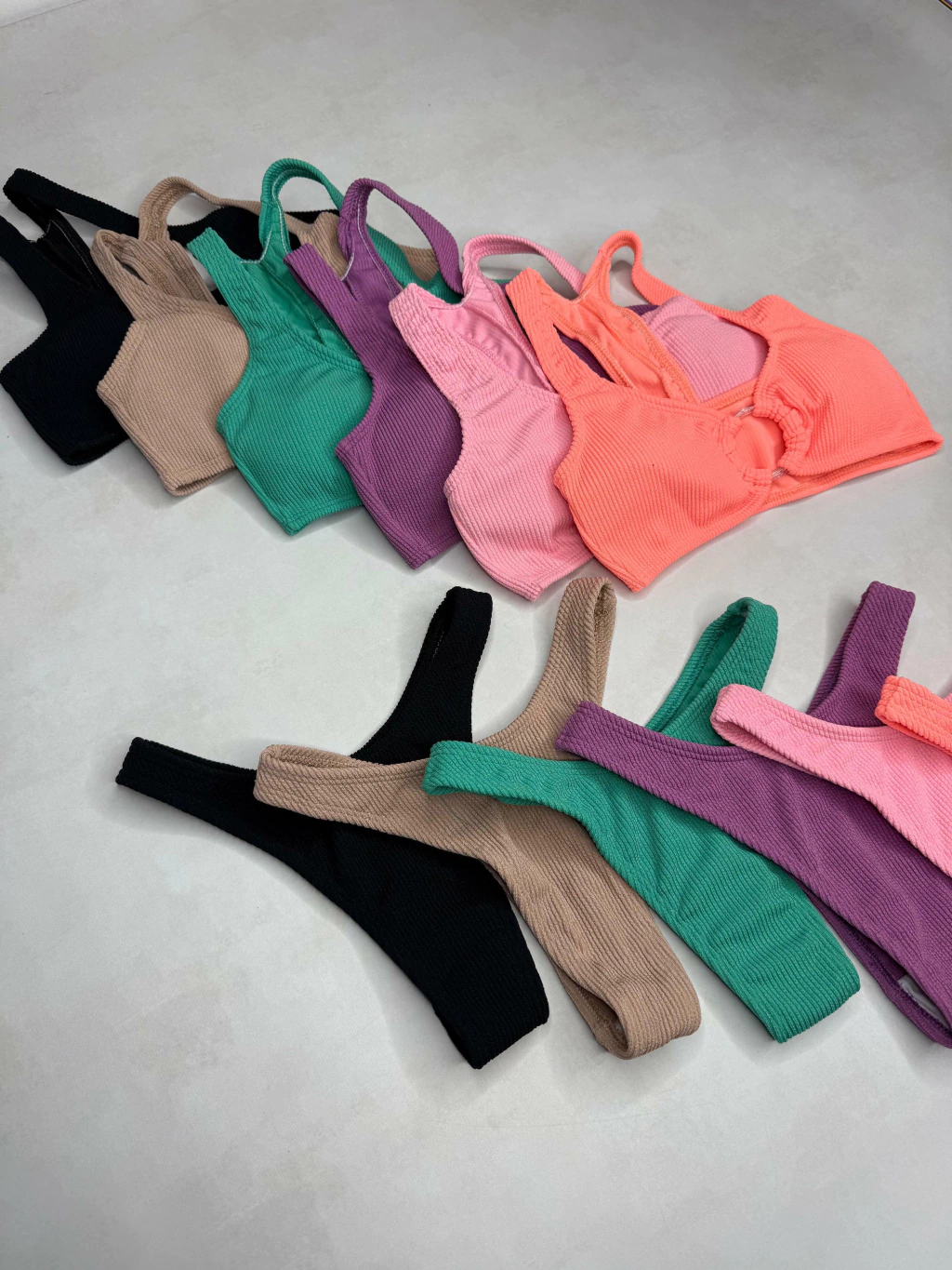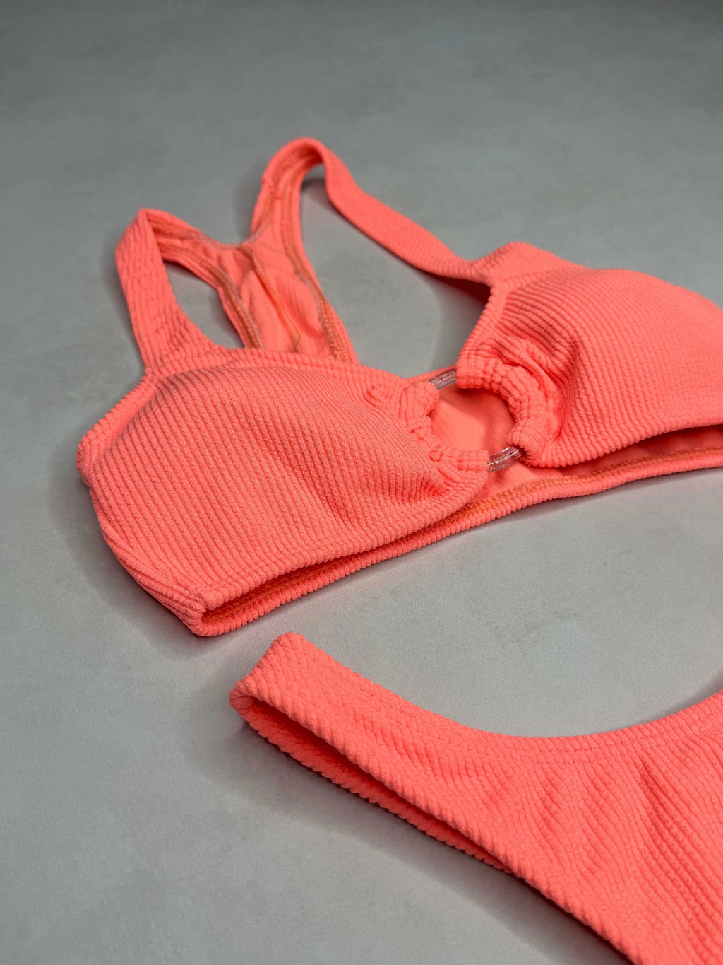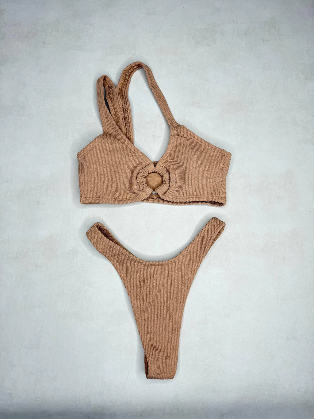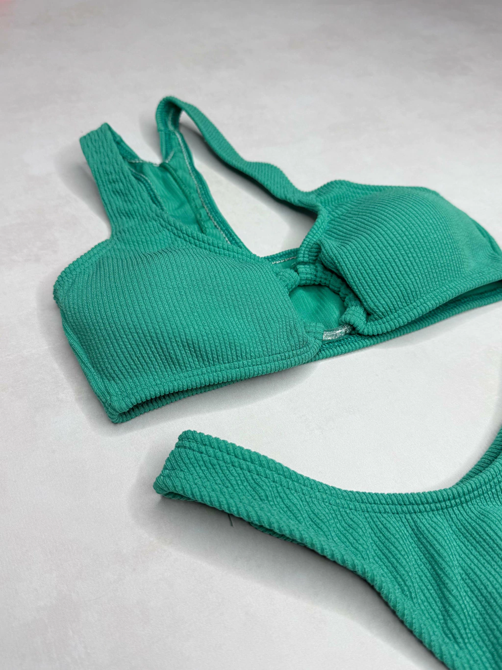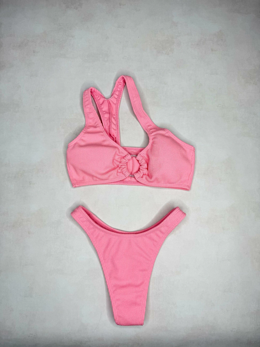 Conjunto de dos piezas, corpiño top con tiras y aro en el centro, bombacha colaless