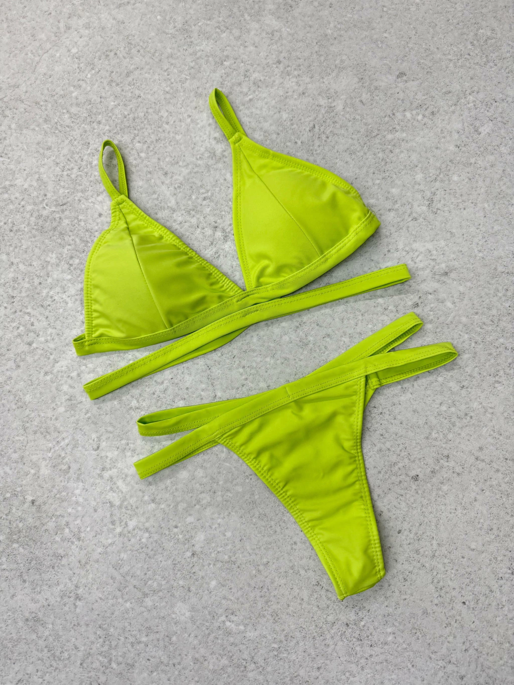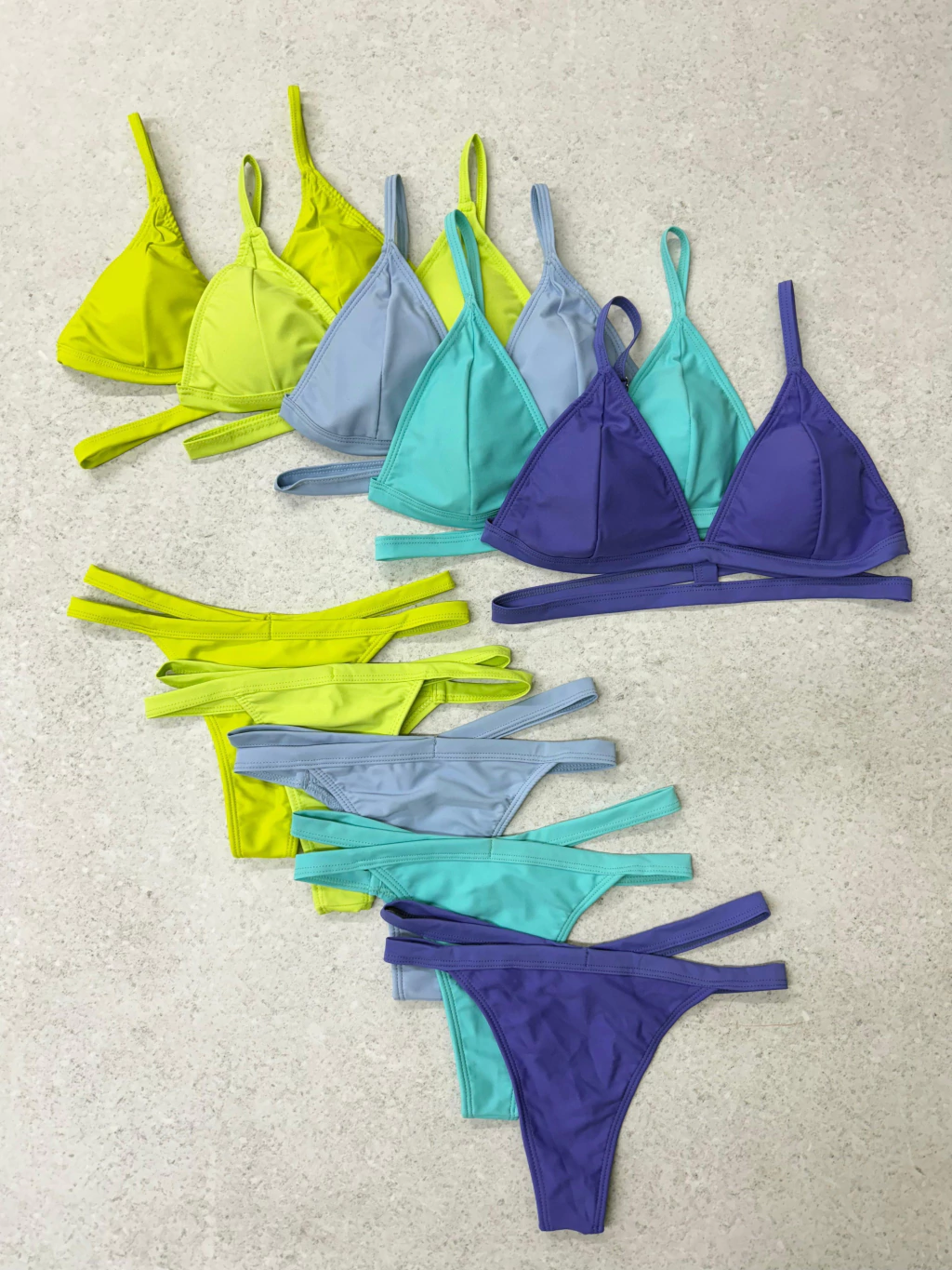 Bikini con tiras en el corpiño y bombacha con tiras tipo colaless.